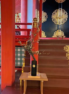 | JR芦屋駅にいけばな展示用のボックスが出来上がりました | 初日3月24日にはケイオウザクラを陶製花器にいけました。 駅にお越しの時はご覧ください |