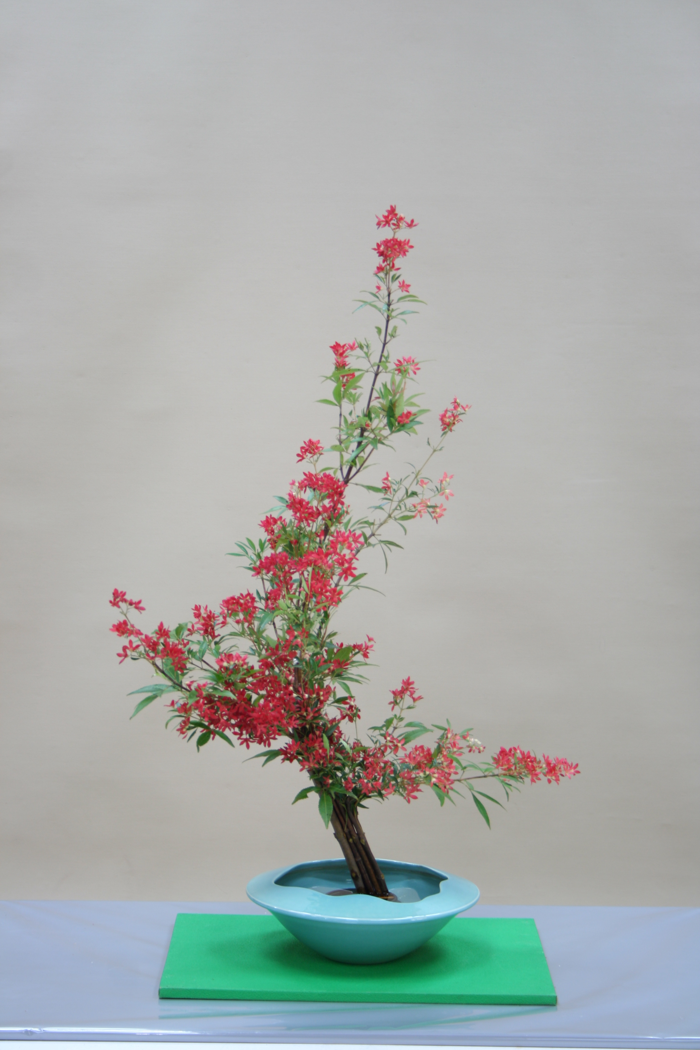 この作品は、ヤブサンザシ、トルコギキョウ、ネリネ、ケイトウを陶製水盤にいけています。